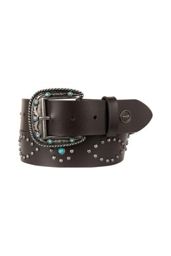 Stud pattern, turquoise studs, removable buckle, Wrangler� iconic logo concho, antique silver hardware.
