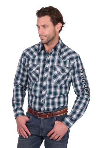 Classic western long sleeve shirt, snap closure, western chest pockets (one with pen holder), western front and back yokes, contrast trim on inside collar stand, Wrangler® iconic logo sleeve embroidery, back neck logo embroidery, contrast inside cuff