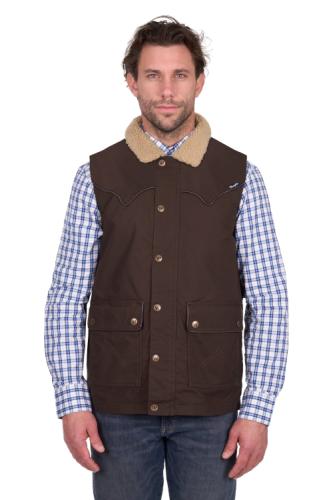 Durable heavyweight canvas vest, mock leather corded piping detail on pockets and yokes, front storm flap with metal zip closure and metal snaps, top and side entry pockets (lined for warmth), longer back hem, internal chest pocket and hem pocket for mobile phone, rust proof metal trims, back neck mock leather badge, sherpa lined body and collar, patch pocket with stitch detailing