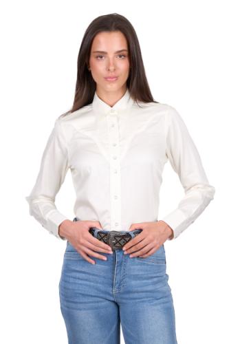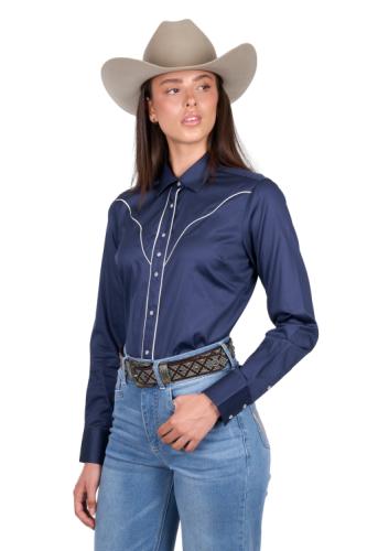 Classic western long sleeve shirt, stretch for comfort and movement, pearl snap closure, western front and back yokes with contrast piping, Wrangler® logo pip on side seam, back neck logo embroidery, right cuff embroidery, extra snap at bust