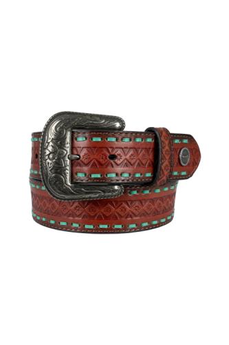 Tooled strap, contrast handlace, removable buckle, Wrangler® iconic concho, antique silver hardware